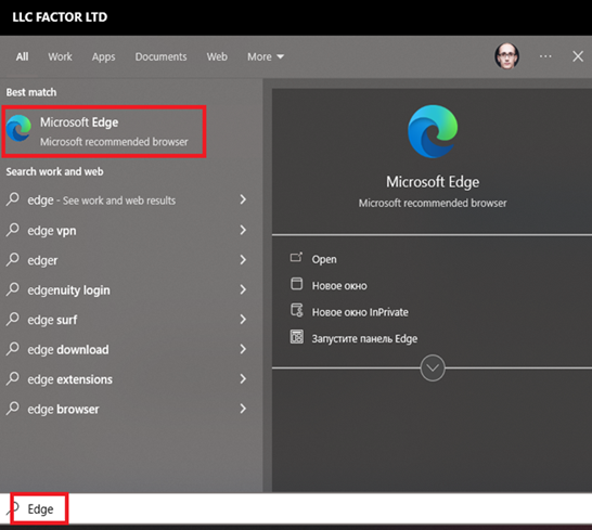 1. Запустить браузер Edge. Для этого можете воспользоваться поиском в панели задач и ввести «Edge»