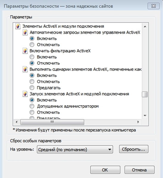 После этого снова откроется вкладка «Безопасность». Нужно нажать кнопку «Другой». Откроется окно с названием «Параметры безопасности – зона надежных узлов». Нужно пролистать список вниз, до заголовка «Элементы ActiveX и модули подключения». Все, что находится ниже этого заголовка до конца списка, должно быть Включено. Если что-то выключено или установлено “Предлагать”, поставьте пункт «Включить» (кроме пункта «Включить фильтрацию ActiveX», он должен быть Выключен). После этого нажмите кнопку «ОК». Появится окно с предупреждением: «Вы действительно хотите изменить настройку для этой зоны?». Нажмите «Да».