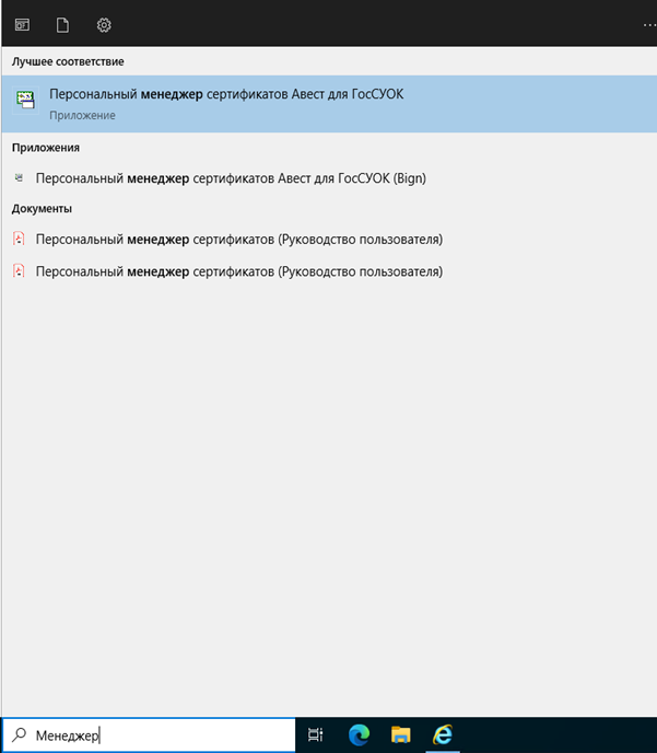 1. Запустить программу «Персональный менеджер сертификатов Авест для ГосСУОК». Можете воспользоваться поиском в панели задач и ввести часть названия программы, после этого выбрать соответствующее приложение