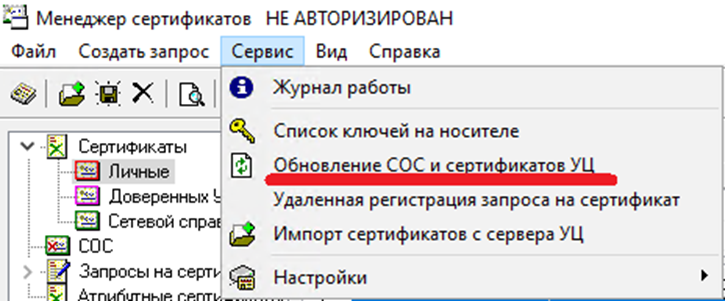 3. Далее нужно нажать «Сервис» и выпавшем списке кликнуть на «Обновление СОС и сертификатов УЦ».