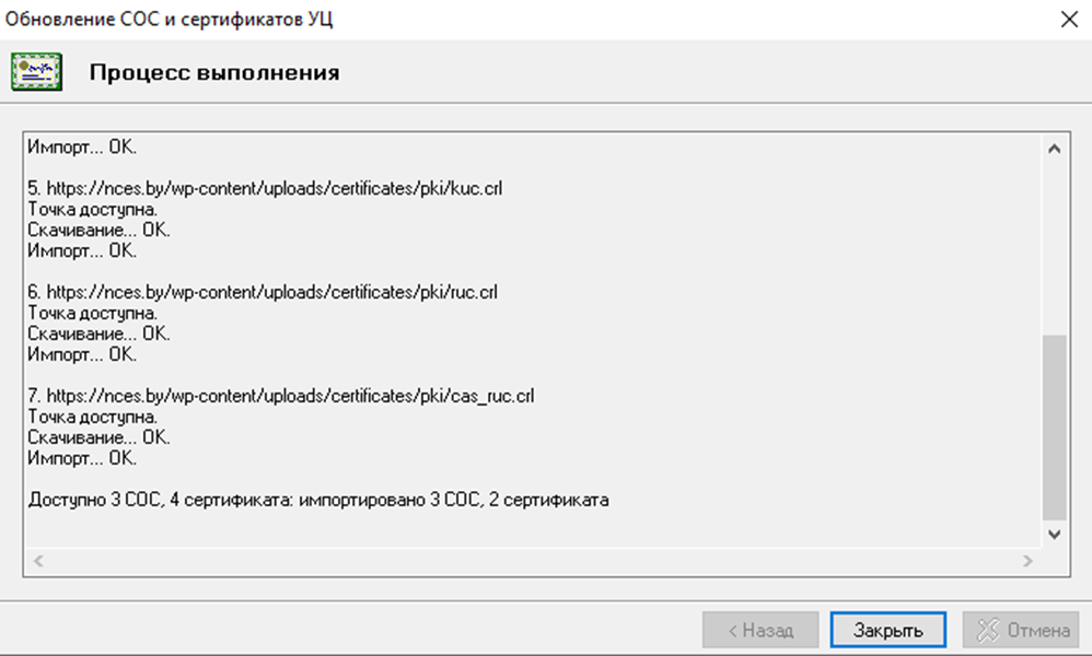 5. После завершения загрузки и импорта сертификатов нужно нажать «Закрыть».