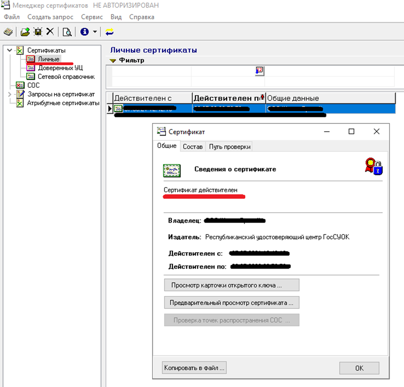 6. После можем проверить что все СОС и сертификаты УЦ успешно импортировались. Для этого нужно в списке личных сертификатов, дважды кликнуть на нужном сертификате. В сведениях о сертификате должна быть надпись «Сертификат действителен».