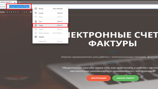 2. Через строку поиска вверху войти на нужный портал, например портал ЭСЧФ –> далее дважды щелкнуть правой кнопкой мыши на адрес сайта, чтобы он выделился –> далее нажать Ctrl+C либо правой кнопкой мыши по адресной строке и выбрать «Копировать».