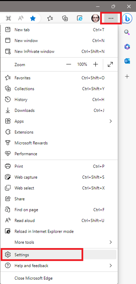 4. Войти в настройки браузера Edge: Нажать три точки в верхнем правом углу и нажать «Настройки».