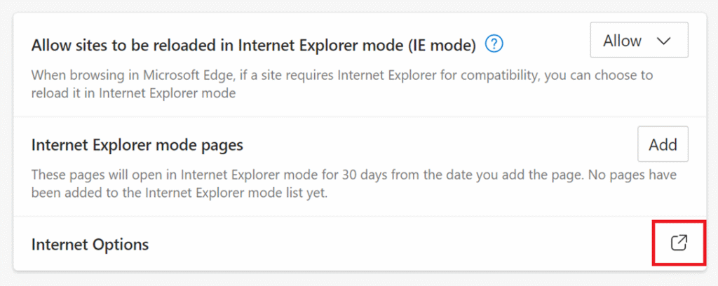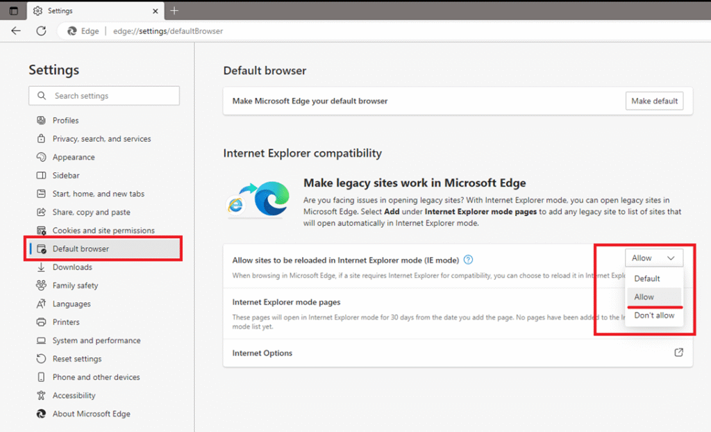 5. Далее выбрать настройку «Браузер по умолчанию». В параметре «Разрешить сайтам перезагружаться в режиме Internet Explorer» выбрать «Разрешить».
