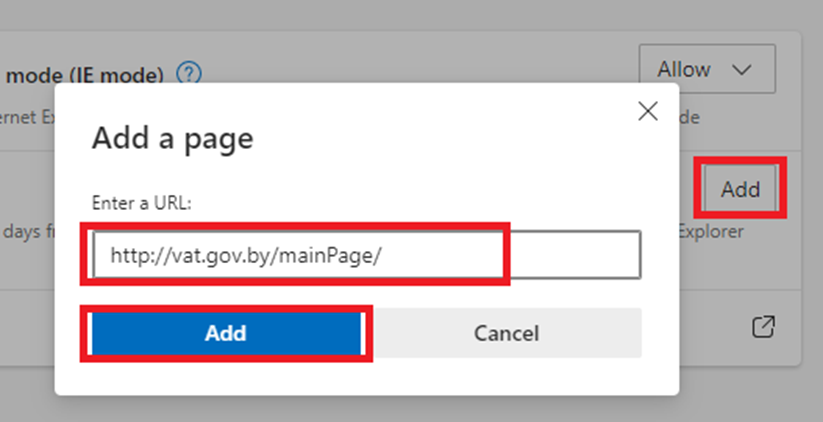 6. В параметрах «Страницы в режиме Internet Explorer» нажать «Добавить», вставить ранее скопированный адрес портала и нажать «Добавить».