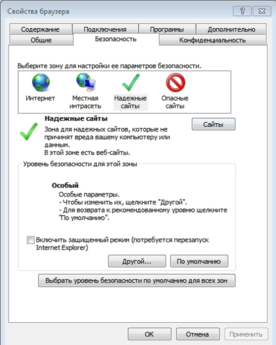 В строке меню выбрать значок шестеренки или кнопку «Сервис» → далее «Свойства обозревателя» (или «Свойства браузера»). Откроется окно свойств IE нужно выбрать вкладку «Безопасность». → Далее нажать на зеленую галочку «Надежные узлы (или сайты)», а затем на кнопку «Узлы (Сайты)».