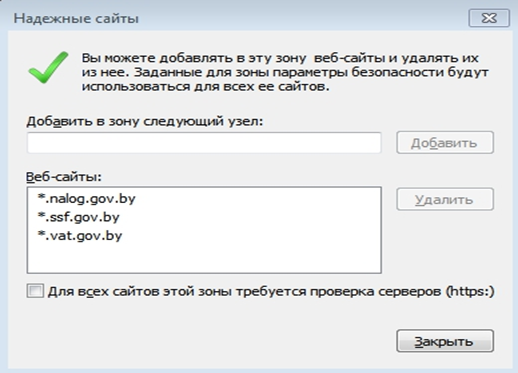 Откроется окно «Надежные узлы». Далее необходимо убрать галочку напротив: «Для всех узлов этой зоны требуется проверка серверов (https:)». В поле «Добавить в зону следующий узел» нужно вписать все адреса, необходимые для работы на порталах, в формате: *.vat.gov.by и нажать кнопку «Добавить» (таким образом в списке должны быть *.vat.gov.by; *.nalog.gov.by; *ssf.gov.by). Далее нажать кнопку «Закрыть».