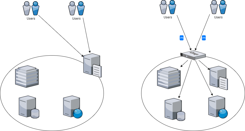 Некоторые специалисты предлагают простое подключения по RDP т.е. «Подключение к удалённому рабочему столу». Это самый простой способ, при котором сотрудник подключается прямо к серверу и на нем работает. Очевидно, что для такого подключения сервер должен находиться вне периметра безопасности сети организации и попытки взлома будут приходится напрямую на сервер. В отличие от использования VPN, когда подключаешься сначала к сети компании, а потом уже имеешь доступ ко всем сервисам. При этом и нужный сервер, и вся сеть защищена файерволом. Это выглядит так: